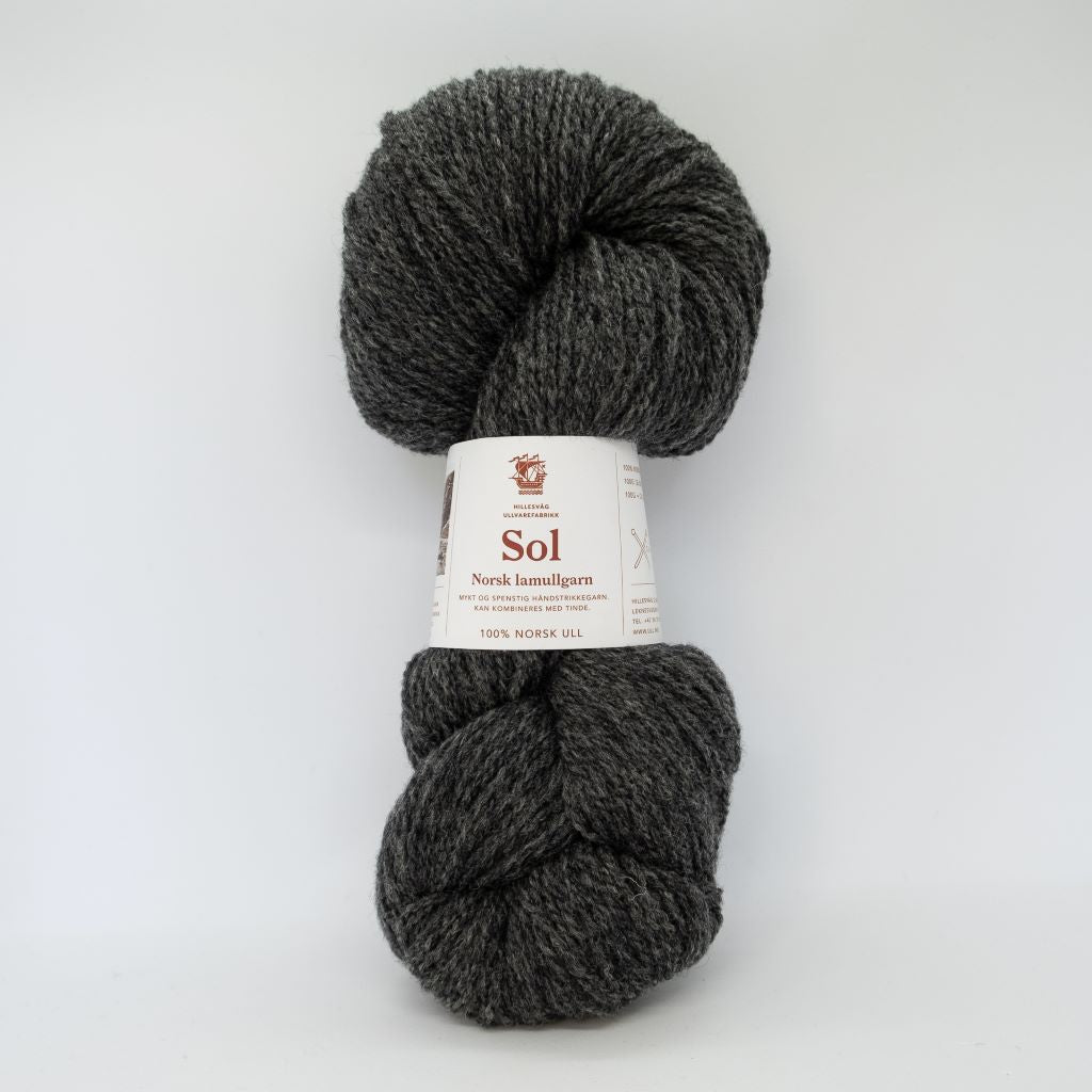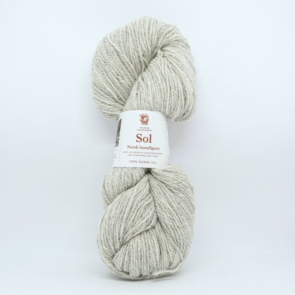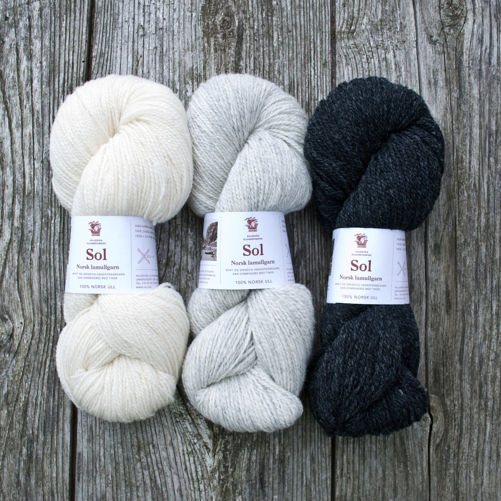 Sol est une laine d'agneau DK (léger), filée à partir des toisons d'agneaux les plus fines (28 microns) d'un mélange de races norvégiennes telles que la Dala et la Ryggja.  Laine des Iles propose le blanc naturel (non-teint) et deux nuances gris de la gamme Sol, qui se combinent parfaitement avec la gamme Tinde de Hillesvåg.  Cette option sera bien utile pour vos jacquards nécessitant du blanc par exemple.  Sol peut bien sûr aussi se tricoter toute seule pour des projets classiques en DK, elle est parfaite pour les tricots texturés.
