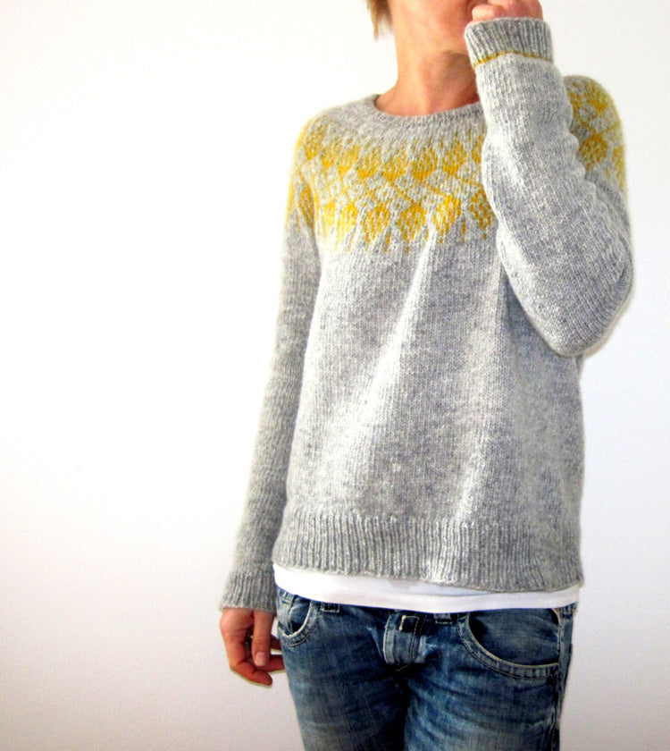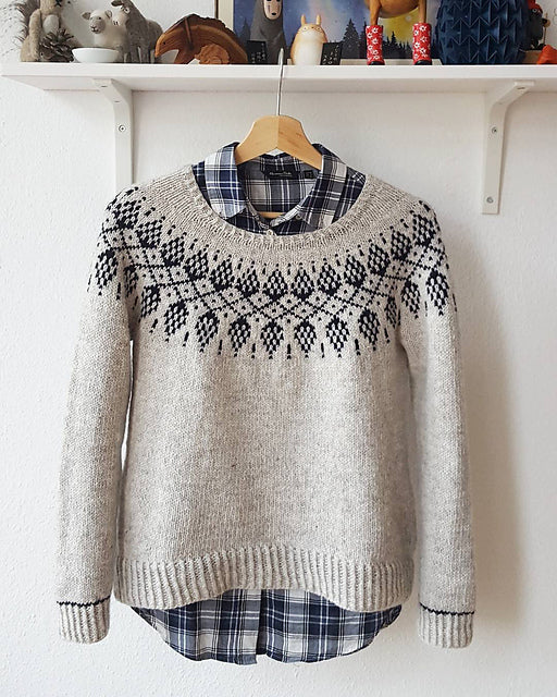 Ce pull à empiècement arrondi se tricote sans couture du haut vers le bas. Après avoir fini le col, les rangs raccourcis sont travaillés en allers-retours afin de créer une encolure plus haute que de coutume dans le dos, puis l’empiècement arrondi est tricoté de haut en bas avec un joli motif jacquard jusqu’à la séparation des manches. Quelques rangs raccourcis supplémentaires sont ajoutés afin de finaliser la mise en forme de l’empiècement, avant que les mailles des manches ne soient mises en attente. Puis, le corps est tricoté jusqu’au bord inférieur. Les manches se travaillent elles aussi du haut vers le bas, en terminant par les poignets.