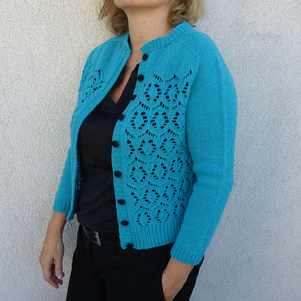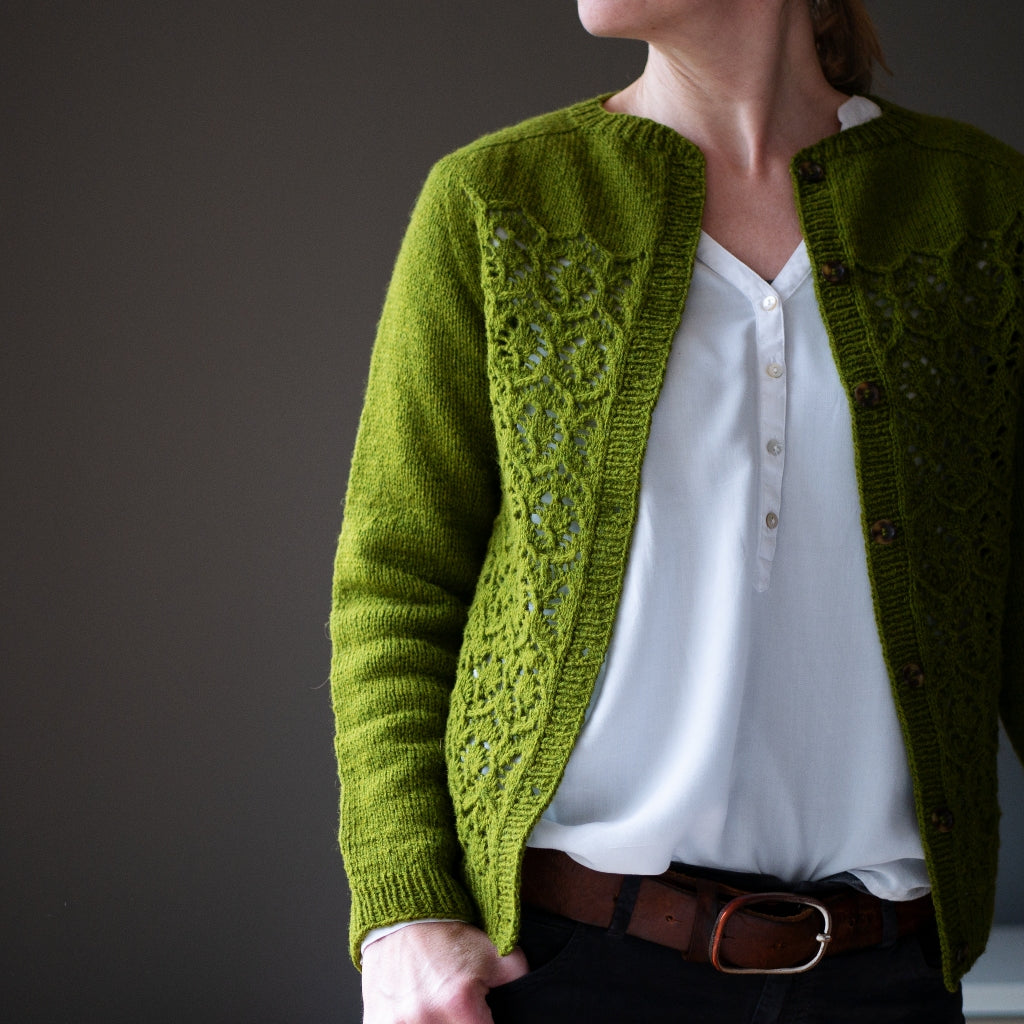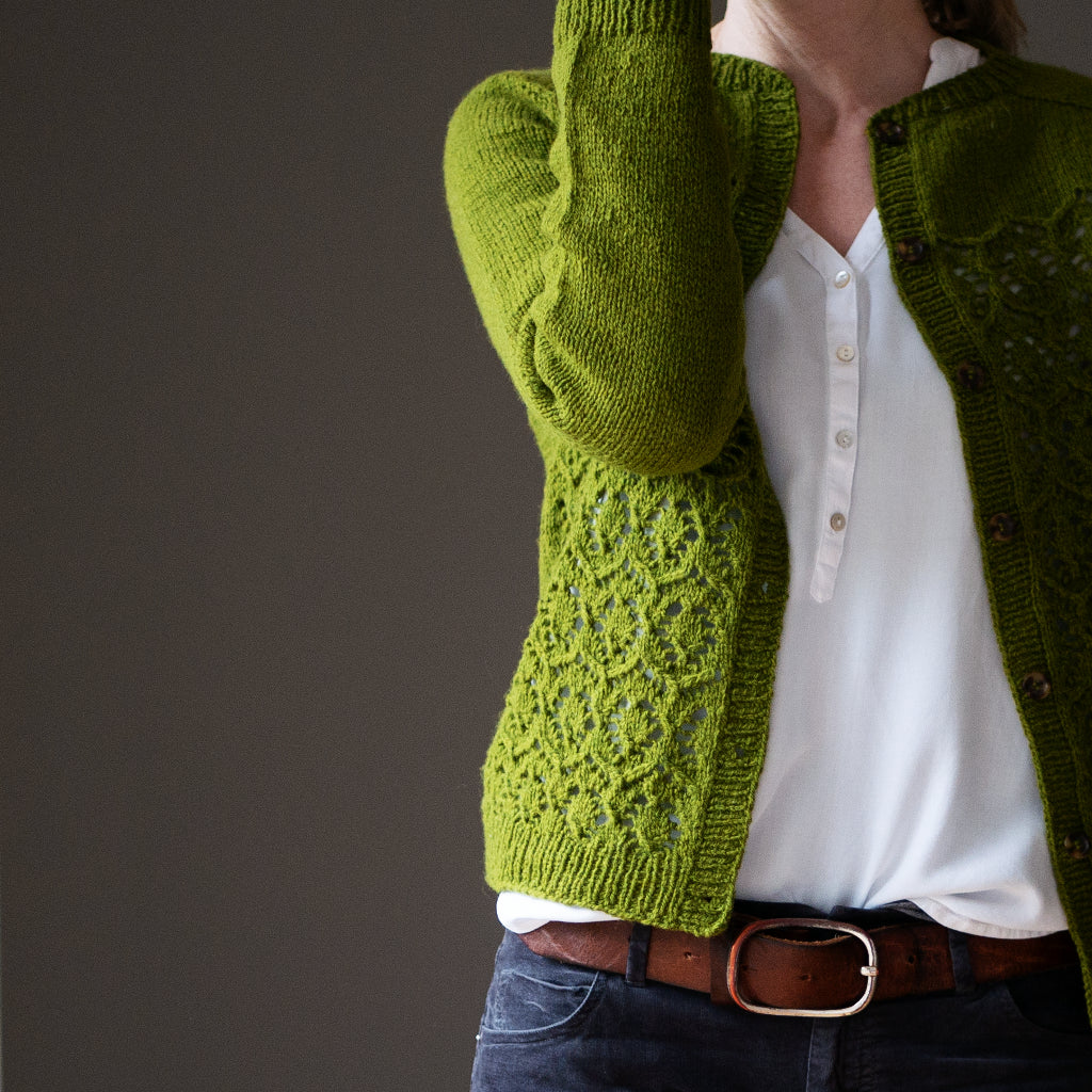 Myrtha est un joli cardigan léger avec dentelle sur les devants, et dos et manches en point jersey. Le corps est tricoté à plat d'une pièce de haut en bas. Les manches sont tricotées en rond, et finalement les mailles sont relevées pour les bandes de boutonnières et l'encolure. Le vert vif et le motif dentelle "Wave and Leaf" (Onde et Feuille) nous rapellent le brise qui fait onduler les arbres au printemps. Et c'est bien le modèle parfait pour le début du printemps!