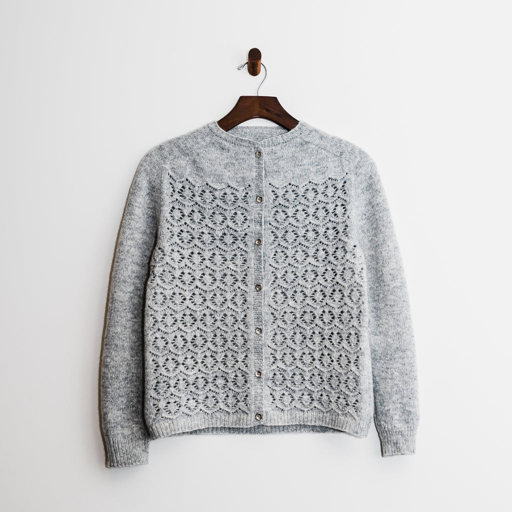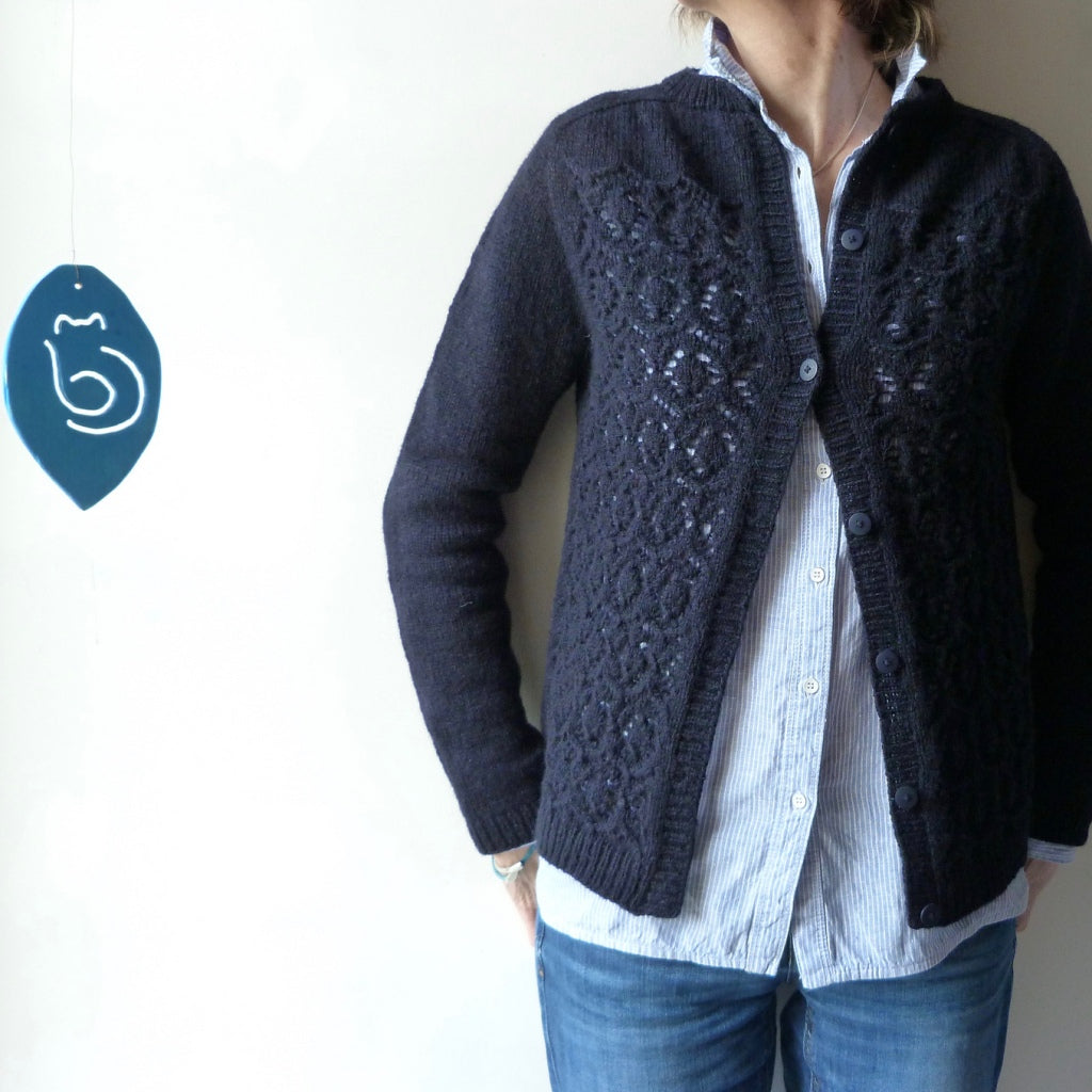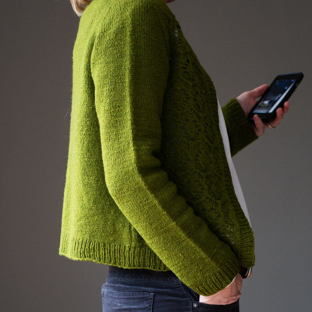 Myrtha est un joli cardigan léger avec dentelle sur les devants, et dos et manches en point jersey. Le corps est tricoté à plat d'une pièce de haut en bas. Les manches sont tricotées en rond, et finalement les mailles sont relevées pour les bandes de boutonnières et l'encolure. Le vert vif et le motif dentelle "Wave and Leaf" (Onde et Feuille) nous rapellent le brise qui fait onduler les arbres au printemps. Et c'est bien le modèle parfait pour le début du printemps!