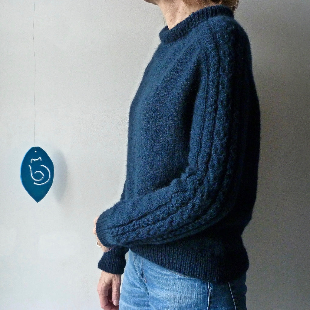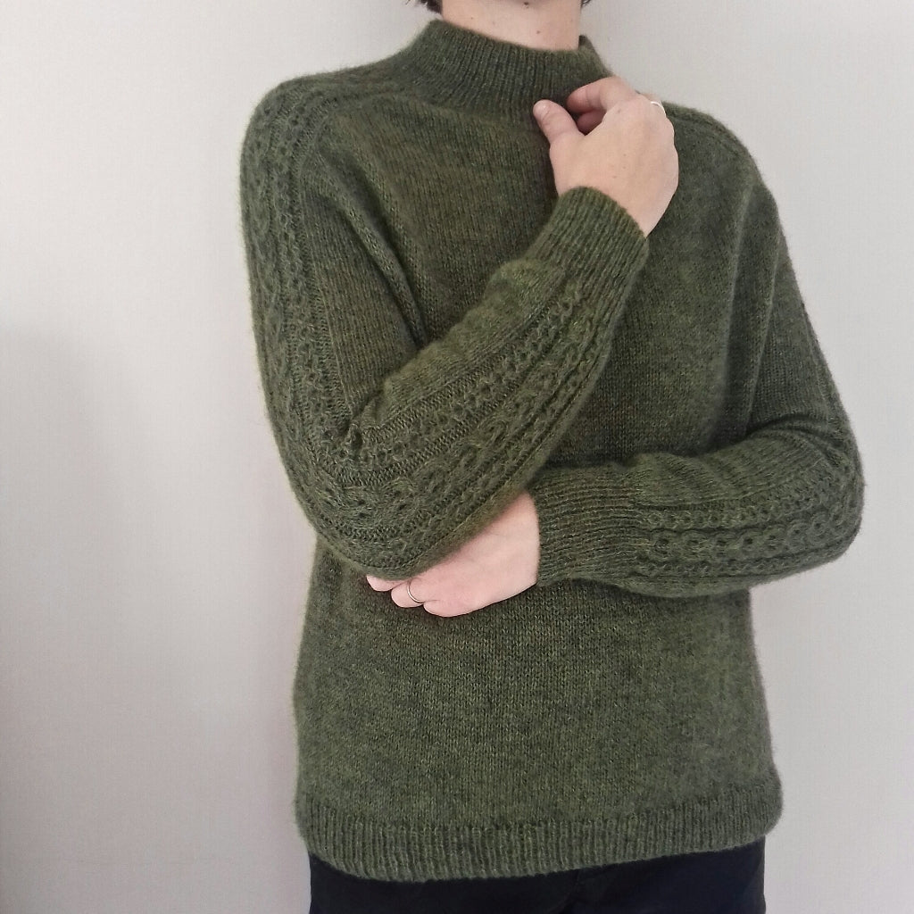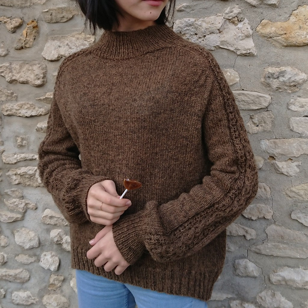 Nook se tricote sans couture du haut vers le bas, avec un beau motif torsadé sur les épaules et les manches. Après avoir tricoté le col, des rangs raccourcis vont façonner l’encolure puis les manches marteaux sont formées grâce à des augmentations. Une fois l’empiècement terminé, les manches sont mises en attente, le corps est travaillé depuis les emmanchures en une seule pièce ; quelques rangs raccourcis apportent plus de longueur dans le dos. Les manches sont ensuite reprises et tricotées en rond jusqu’aux poignets.