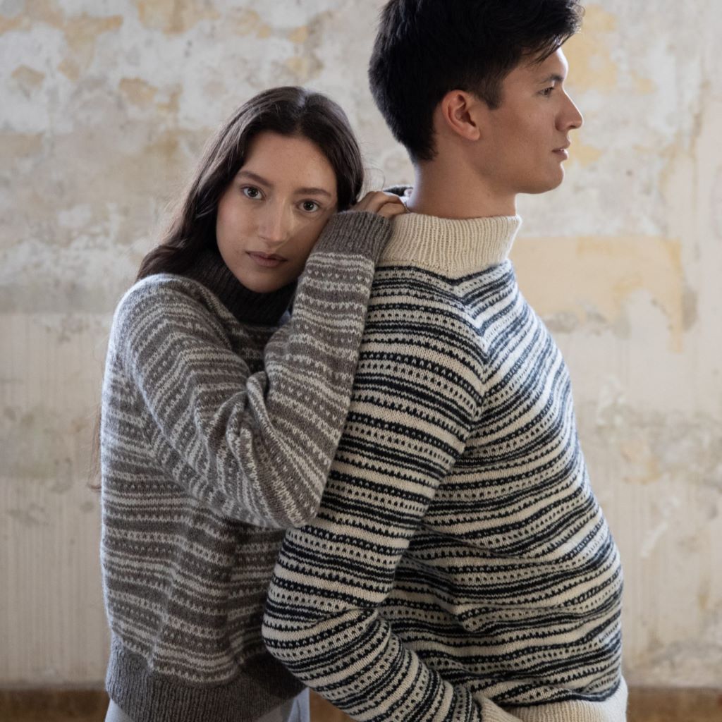 Tous les modèles de la collection Efterår sont unisexes et les instructions permettent de les tricoter en taille femme ou homme.  Veuillez noter que les quantités de fil et la longueur des pulls sont différentes pour les versions homme et femme, mais que les tailles générales, basées sur le tour de poitrine, sont identiques.